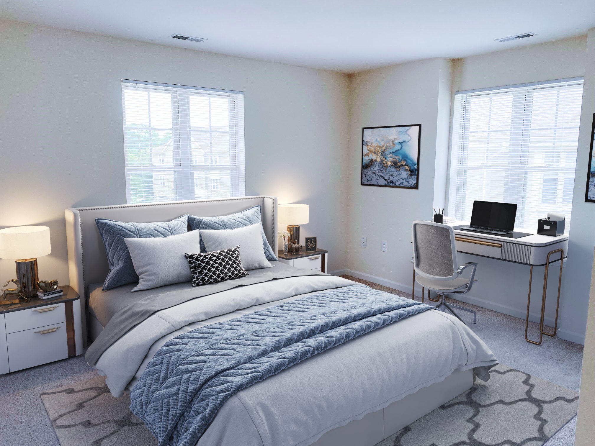 - Brushed silver lever hardware throughout