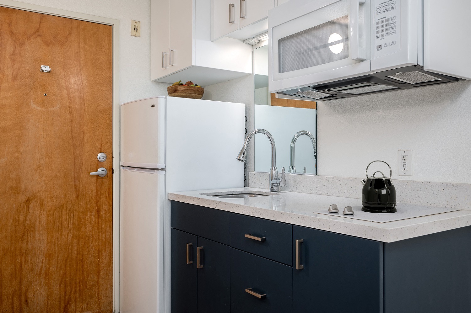 - Kitchenette with Fridge, Two-Burner Cooktop, Microwave