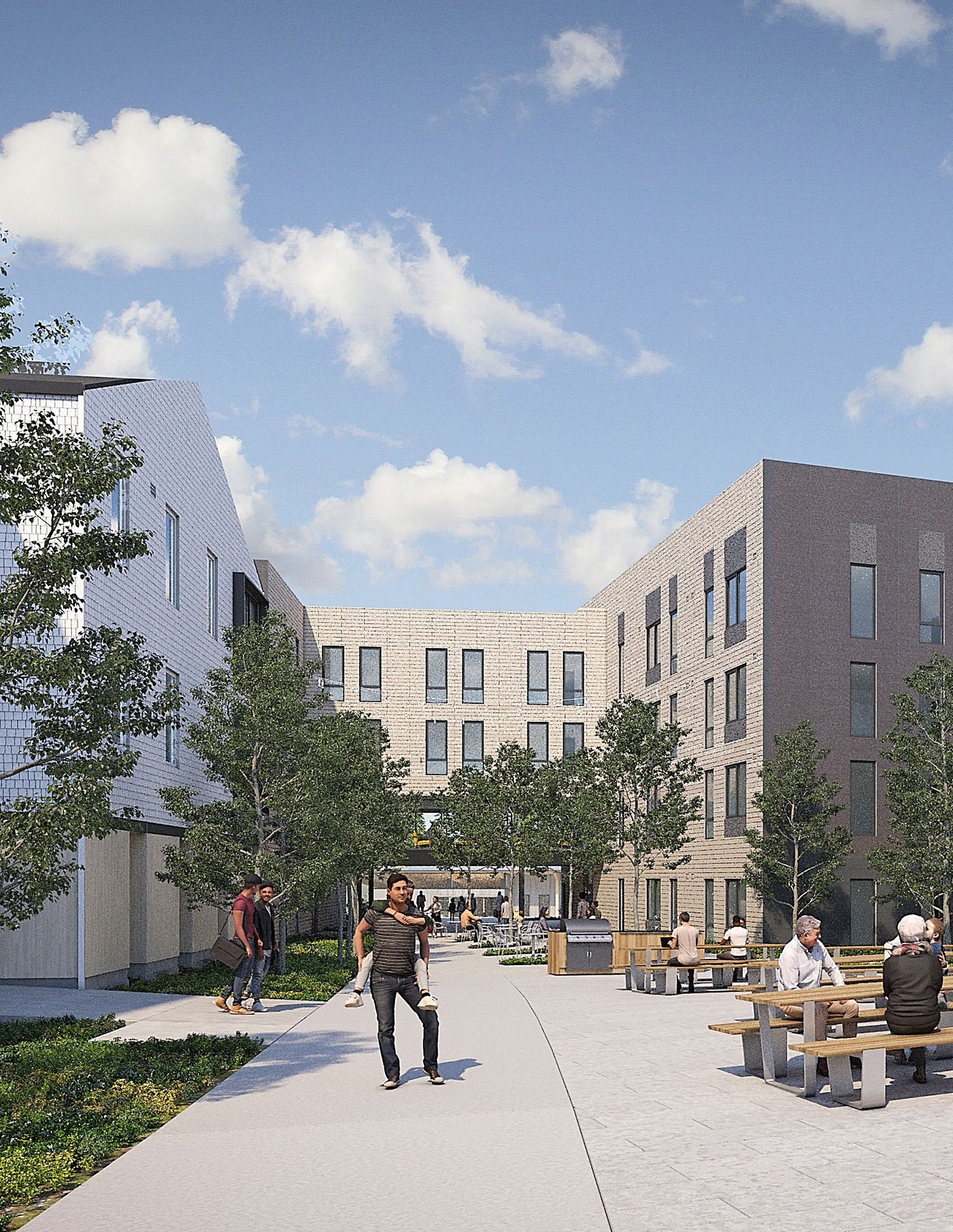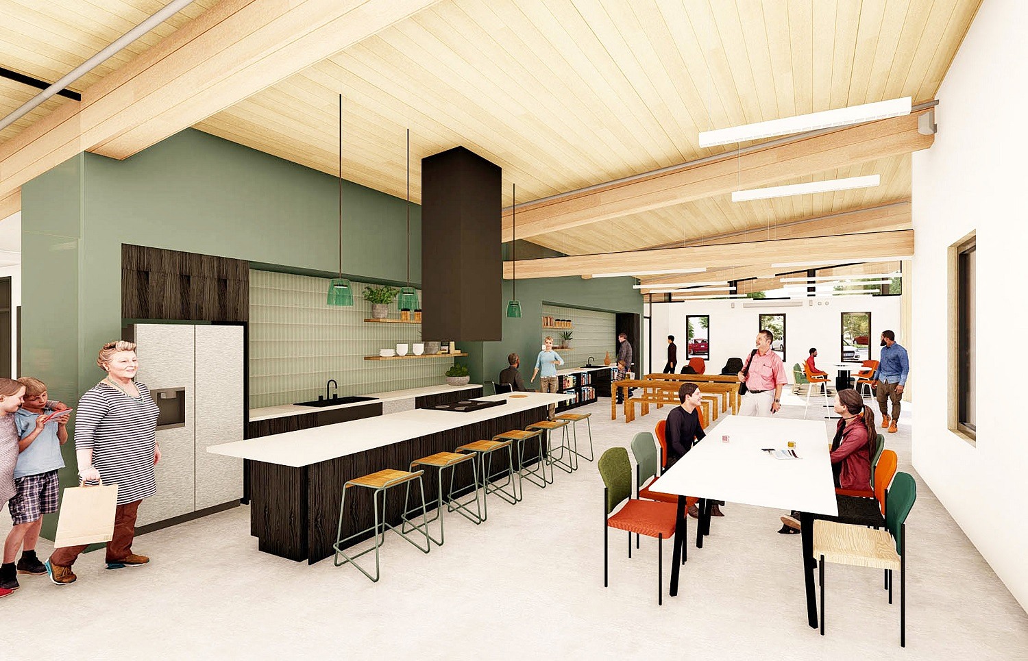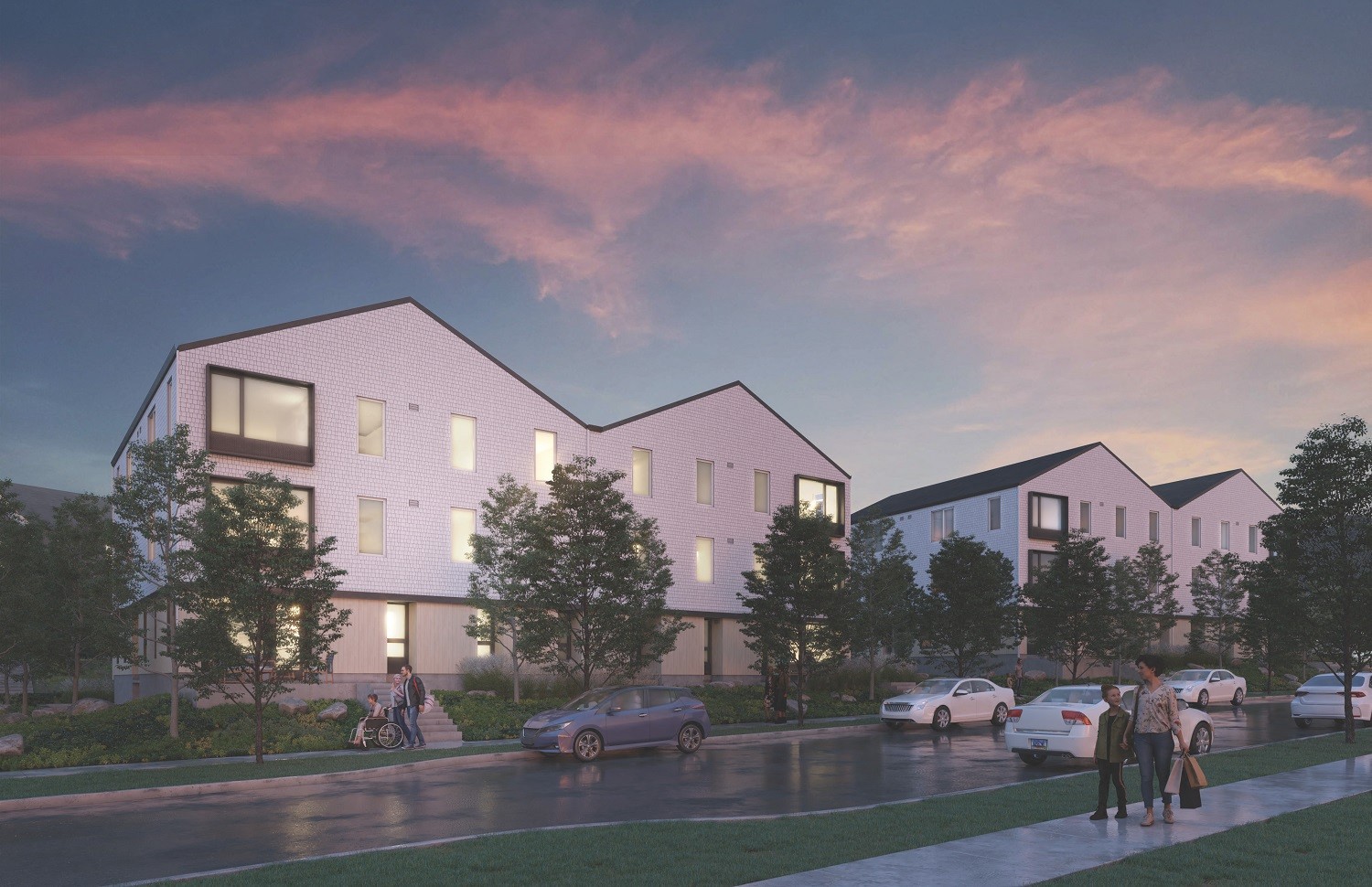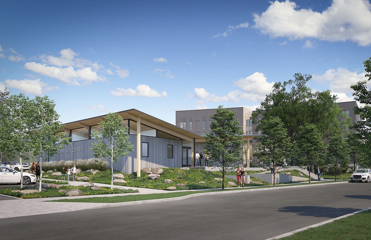 - Central community building with a community kitchen, food pantry, and multi-purpose rooms