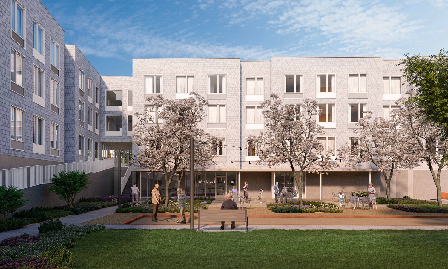 Community amenities will include a trail system along existing wetlands, gardens, an outdoor play area, and a dedicated community building for resident services and programming.